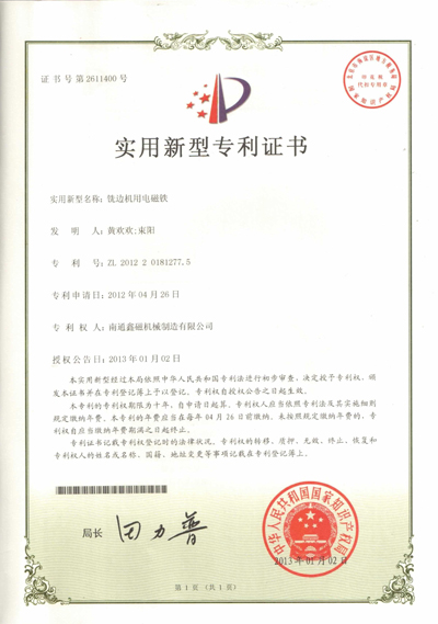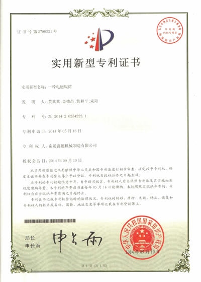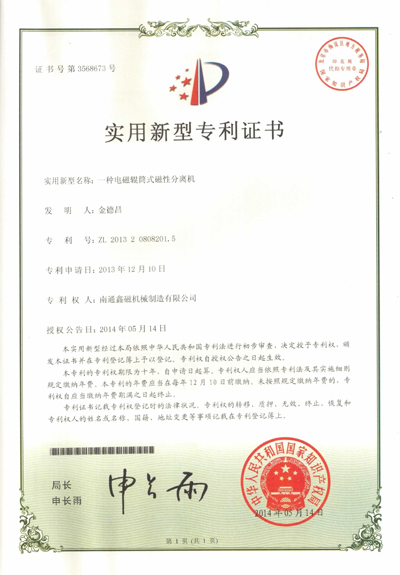 一種電磁輥筒式磁性分離機(jī)專利證書