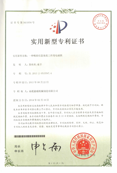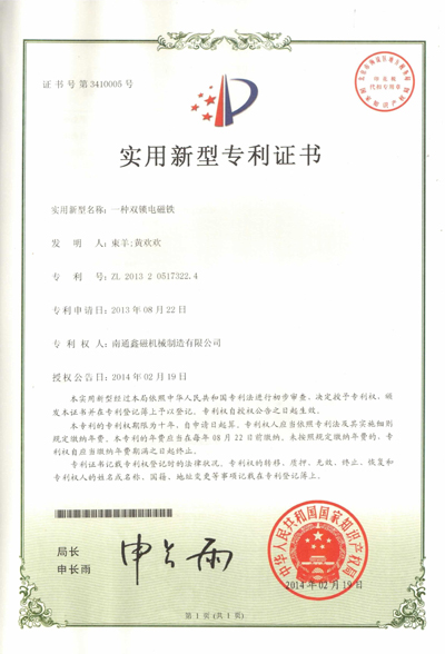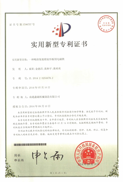 一種吸持集裝箱波形板用電磁鐵專利證書